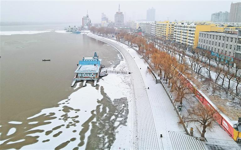 11月24日,冰城哈尔滨降下今冬第二场雪。雪花飘飘,道外江畔在白雪的映衬下更加美丽。(