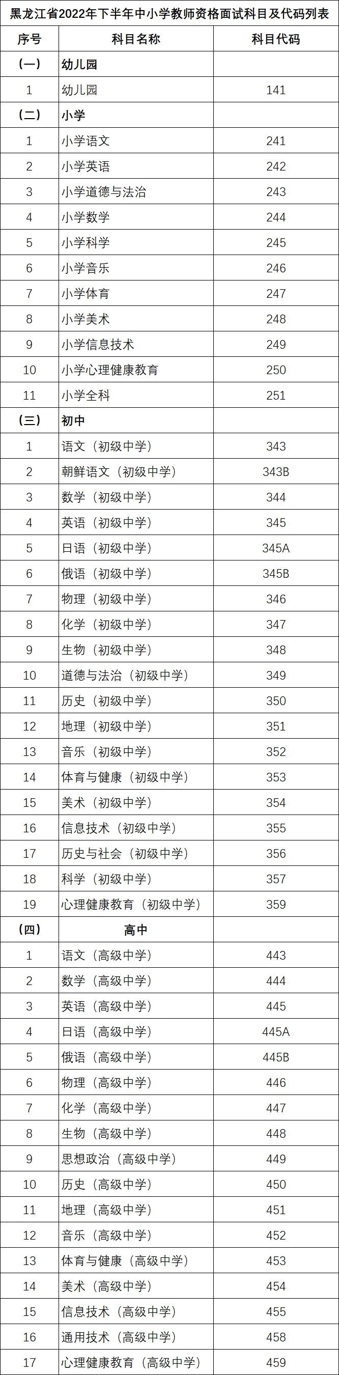 1.黑龙江省2022年下半年中小学教师资格面试科目及代码列表