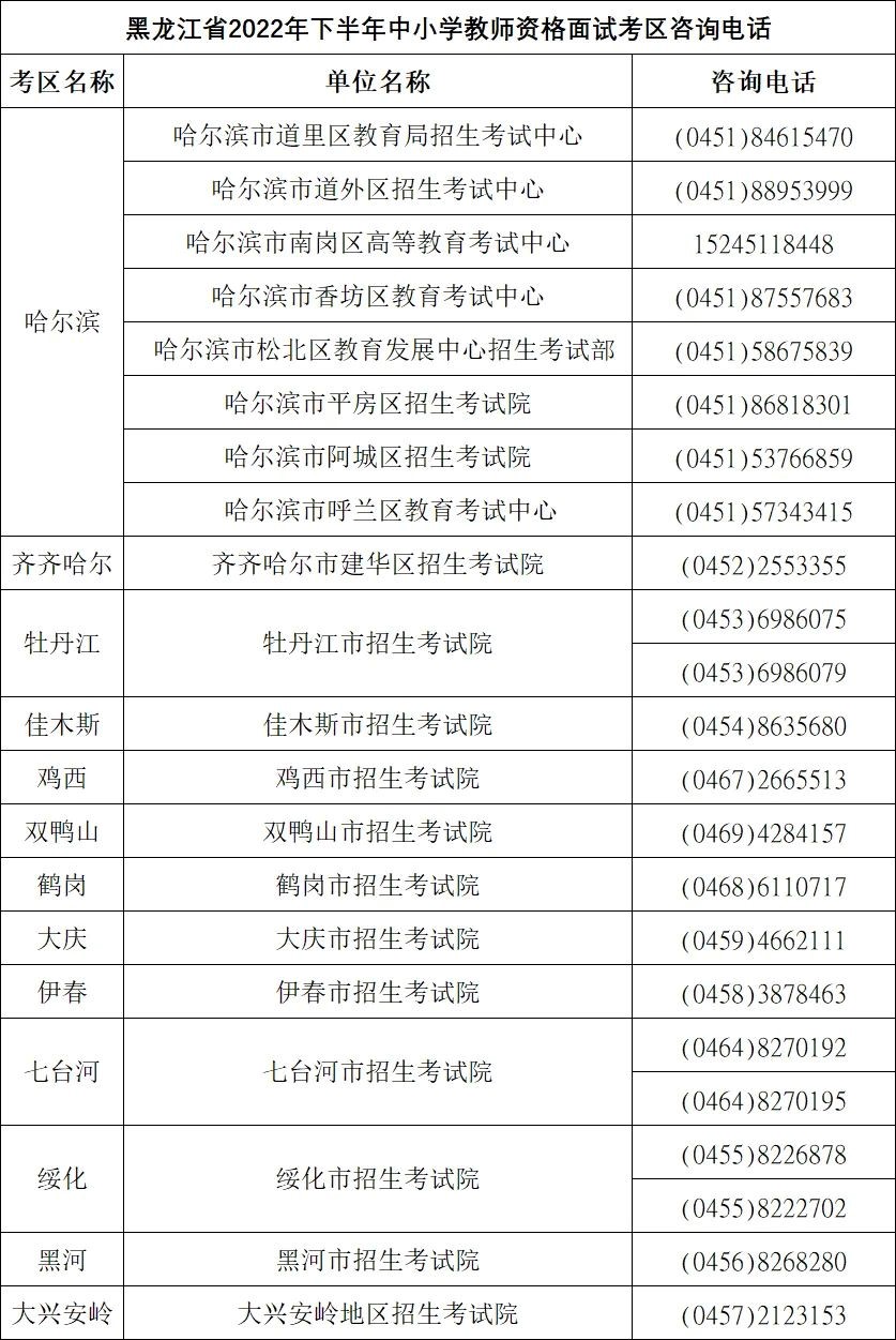2.黑龙江省2022年下半年中小学教师资格面试各考区咨询电话