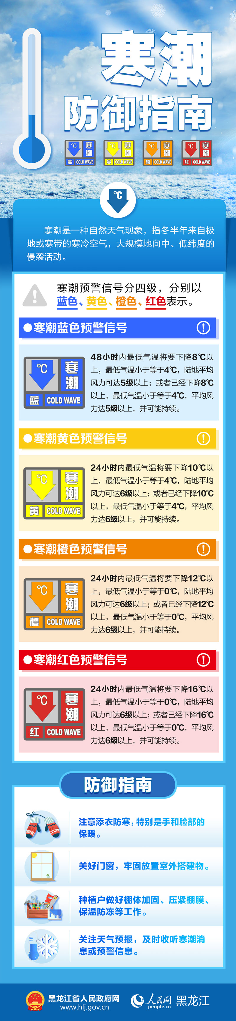 黑龙江省气象台12月11日14时00分发布寒潮预报:预计12日至14日,大兴安岭最低气温下降8~10℃,黑河、伊春、齐齐哈尔、大庆、绥化、哈尔滨、鹤岗、佳木斯、双鸭山、七台河、鸡西、牡丹江最低气温下降10~12℃,局地12~14℃。